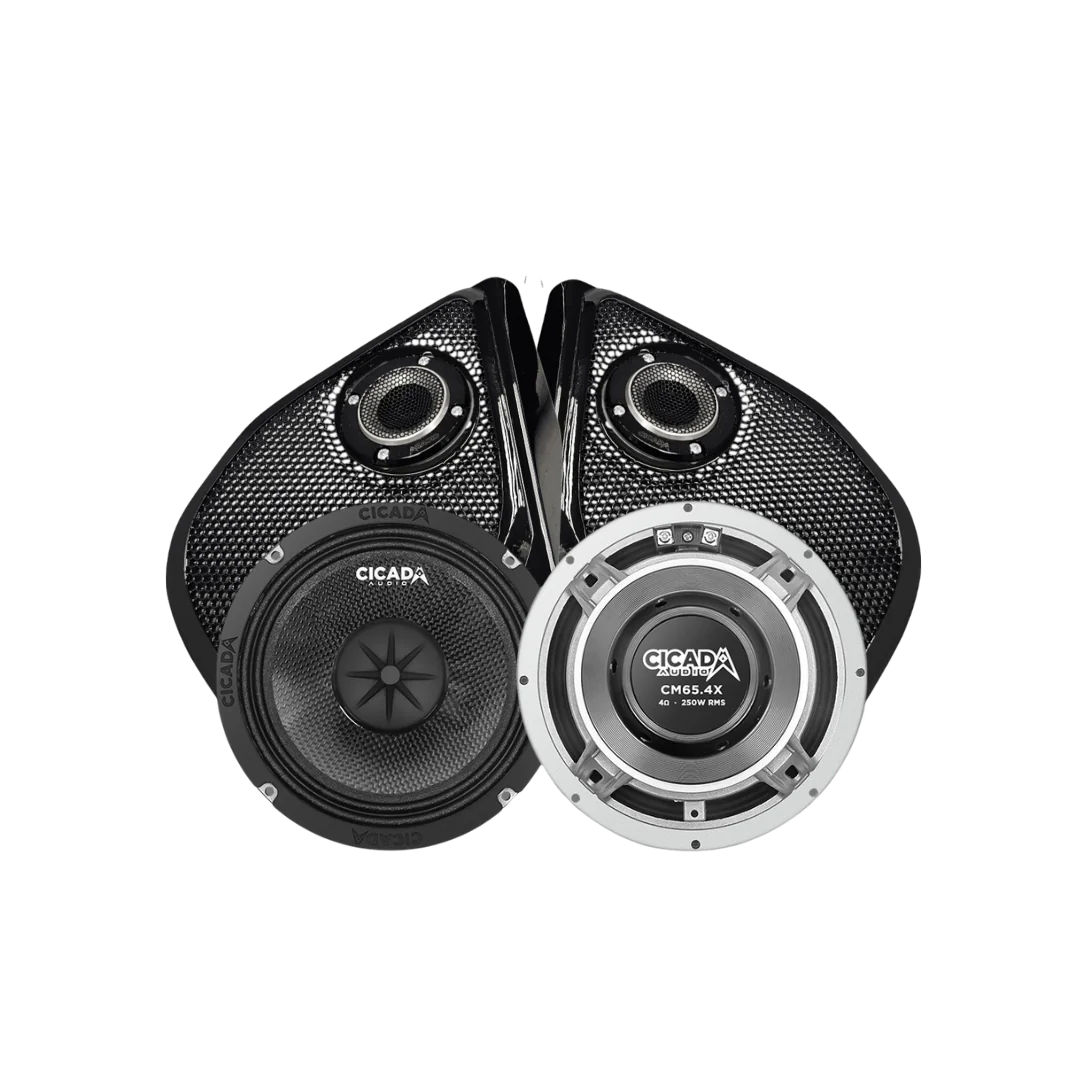 Vendor:Cicada AudioCicada Audio CM65X 6.5-inch Mid-Bass Component Speakers with CMC™ Cones FEATURES Designed exclusively for 2014 to current H-D® factory designed locations Rain or Shine™ all weather performance design OFC Copper shorting ring for extended high frequency performance Carbon Matrix Composite™ (CMC™) cone is lightweight, strong, high temperature resistant, and exceptionally efficient OFC Copper wire voice coil with Black Coat™ ensures high conductivity, low resistance, and extreme thermal performance N35SH Neodymium magnet motor Die cast Aluminum custom tooled basket with Vortex Flow Venting™ Two (2) year warranty SPECIFICATIONS 4Ω / 6.5-inch mid-bass driver Power Handling: 250W RMS / 500W MAX Voice Coil: 2-inch/51mm mid-bass Cone: Carbon Matrix Composite™ Magnet: Neodymium Sensitivity: 94 dB, 1W / 1M Frequency Response: 70 Hz – 10 kHz +/- 3 dB Mounting Depth: 2.3-inch/58mm Mounting Diameter: 5.7-inch/144mmSale -